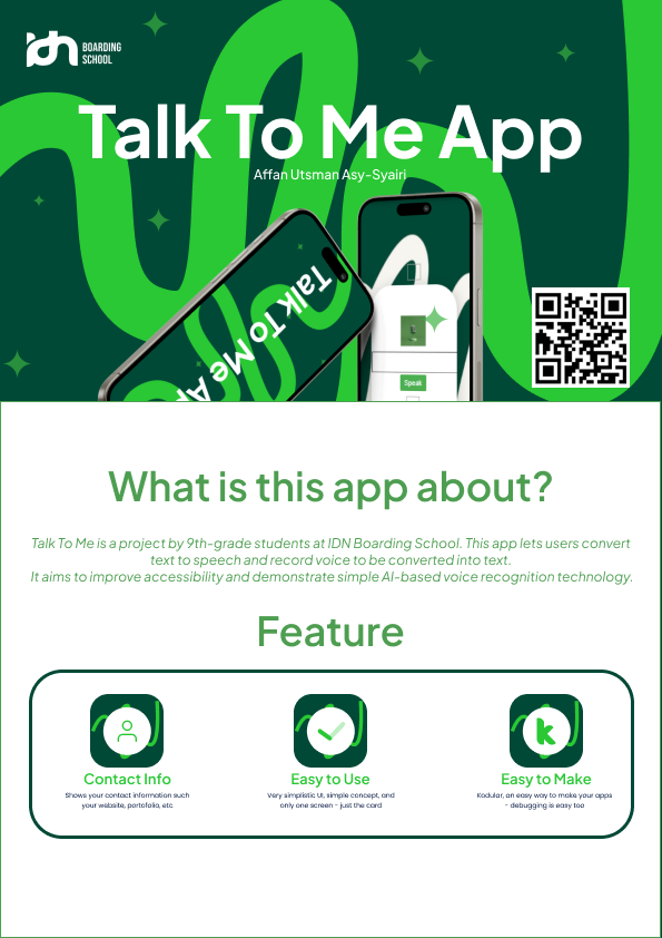 And,Hi everyone, This is my project in IT Lesson to accomplish the target, this project i have to make a Design and code in Kodular. My project name is “Talk To Me”.Talk To Me App is a simple application built with Kodular that can convert text into speech (Text-to-Speech), allowing users to listen to the text they type or enter into the app.