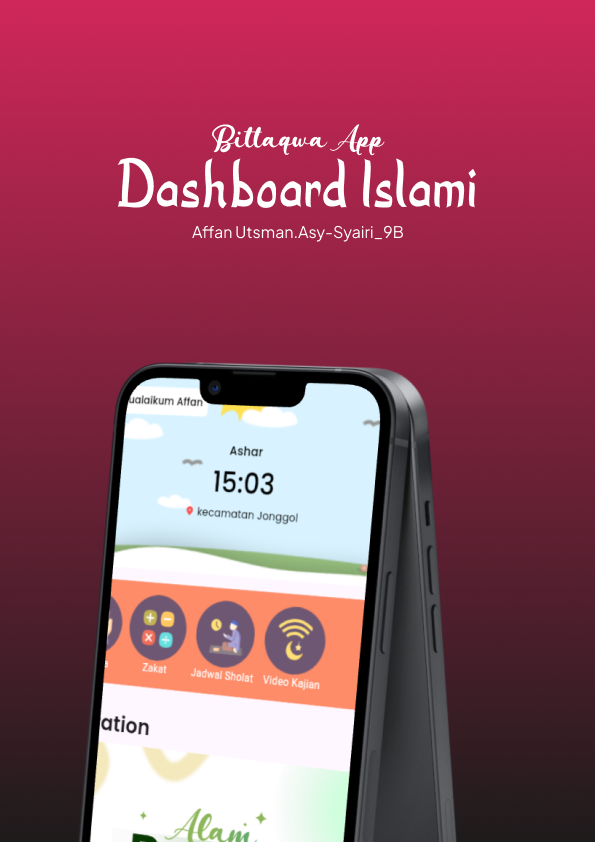 BittaQwa App adalah aplikasi islami yang dibuat menggunakan Flutter untuk membantu umat muslim dalam menjalankan ibadah sehari-hari. Pada halaman Dashboard, pengguna disambut dengan ucapan “Assalammualaikum [Nama Pengguna]”, disertai informasi waktu sholat saat ini dan lokasi pengguna. Tampilan utama menampilkan empat menu utama yaitu Doa-doa, Zakat, Jadwal Sholat, dan Video Kajian yang memudahkan akses ke fitur penting. Selain itu, terdapat bagian Inspiration yang berisi konten islami seperti “Alam Barzah” untuk menambah wawasan dan motivasi spiritual. Desain aplikasi dibuat dengan gaya modern, warna lembut, serta tata letak yang responsif, menciptakan pengalaman pengguna yang nyaman
