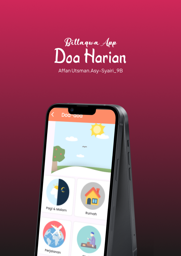 Halaman Doa-doa pada aplikasi BITTAQWA berfungsi sebagai panduan bagi pengguna untuk mempelajari dan mengamalkan doa-doa sehari-hari. Dengan tampilan cerah dan ilustrasi bernuansa islami, halaman ini menampilkan berbagai kategori doa seperti Pagi & Malam, Rumah, Makanan & Minuman, Perjalanan, Sholat, dan Etika Baik. Setiap kategori dilengkapi ikon yang mudah dikenali agar pengguna dapat menemukan doa sesuai kebutuhan dengan cepat. Desainnya yang sederhana dan menarik membuat pembelajaran doa menjadi lebih menyenangkan serta membantu pengguna membiasakan diri berdoa dalam setiap aktivitas sehari-hari.
