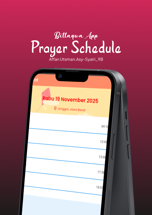 Halaman Jadwal Sholat pada aplikasi BITTAQWA menampilkan waktu sholat harian secara lengkap dan akurat berdasarkan lokasi pengguna, seperti Jonggol, Jawa Barat. Pada bagian atas terdapat tanggal hari ini, diikuti daftar waktu sholat mulai dari Subuh, Dzuhur, Ashar, Magrib, hingga Isya, masing-masing dilengkapi ikon alarm sebagai pengingat. Desainnya bersih, sederhana, dan mudah dibaca, sehingga pengguna dapat mengetahui jadwal sholat dengan cepat dan lebih teratur dalam menjalankan ibadah.