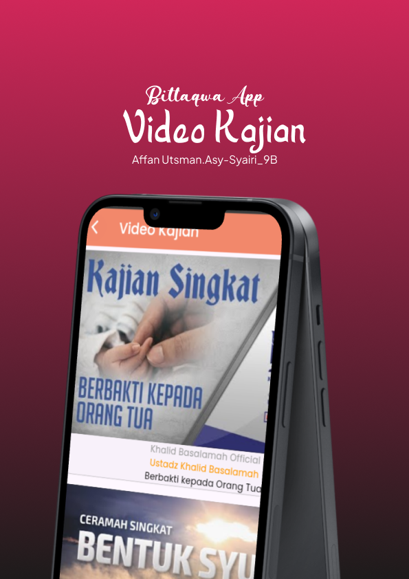 Halaman Video Kajian pada aplikasi BITTAQWA menampilkan kumpulan ceramah dan kajian islami dari berbagai ustadz, disajikan dalam bentuk kartu video yang rapi dan mudah diakses. Pengguna dapat melihat thumbnail kajian, nama kanal, nama ustadz, serta judul materi yang dibahas, seperti “Berbakti kepada Orang Tua” dan “Bentuk Syukur”. Desain halaman ini dibuat sederhana dan informatif agar pengguna dapat memilih dan menonton kajian dengan cepat, sekaligus menambah wawasan keislaman melalui konten yang ringkas dan bermanfaat.