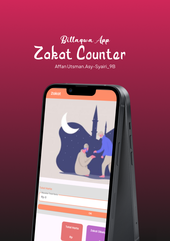 Halaman Zakat pada aplikasi BITTAQWA dirancang untuk memudahkan pengguna menghitung dan menunaikan zakat secara digital. Dengan desain sederhana bernuansa oranye dan ungu lembut, halaman ini menampilkan ilustrasi orang yang sedang berzakat di depan masjid sebagai simbol kepedulian sosial. Pengguna cukup memasukkan total harta pada kolom yang tersedia, lalu menekan tombol OK untuk melihat hasil perhitungan zakat yang harus dikeluarkan (2,5%). Di bagian bawah, terdapat dua kotak informasi yaitu Total Harta dan Zakat Dikeluarkan yang menampilkan hasil input dan perhitungannya. Tampilan ini dibuat agar pengguna dapat memahami kewajiban zakat dengan mudah, cepat, dan bermakna.